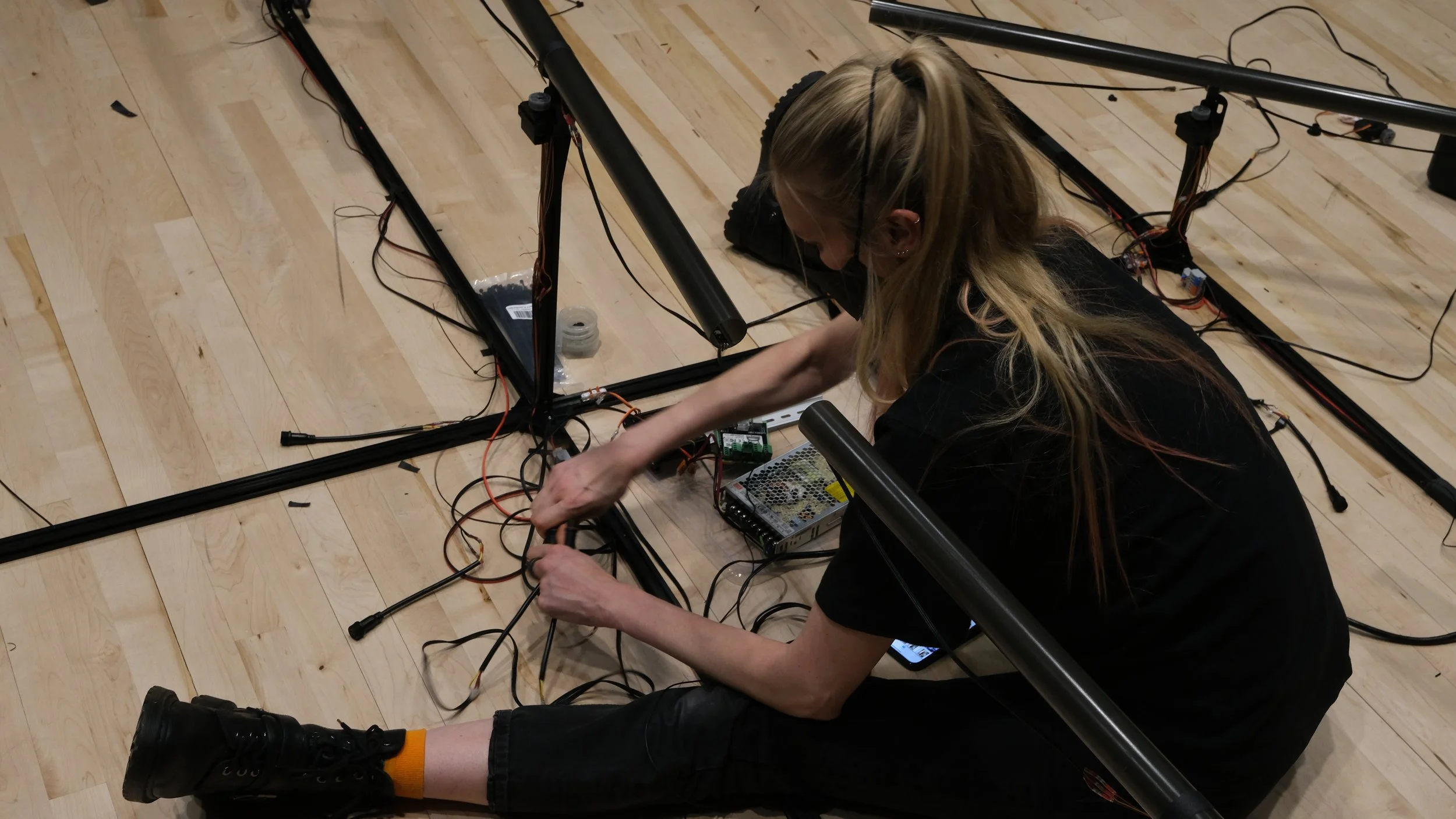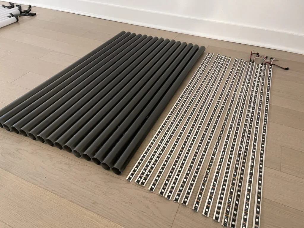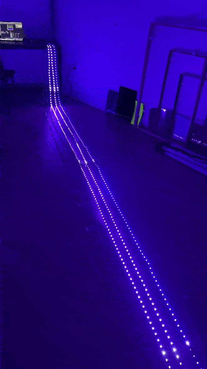 The LEDs are programmed using Touchdesigner via DMX, sACN protocol & 16 universe pixel controller. The intention was to have the tube construction complete in time to experiment with the numerous possibilities available for programming movement, speed & textures into our 450 points of light. Proposed possible outputs include: communicating natural forms: waves, motion, symmetries to gradual fades. In the end, construction took longer than expected so there was less time to expand on our LED and servo outputs. Many ideas have already been considered for future project iterations.