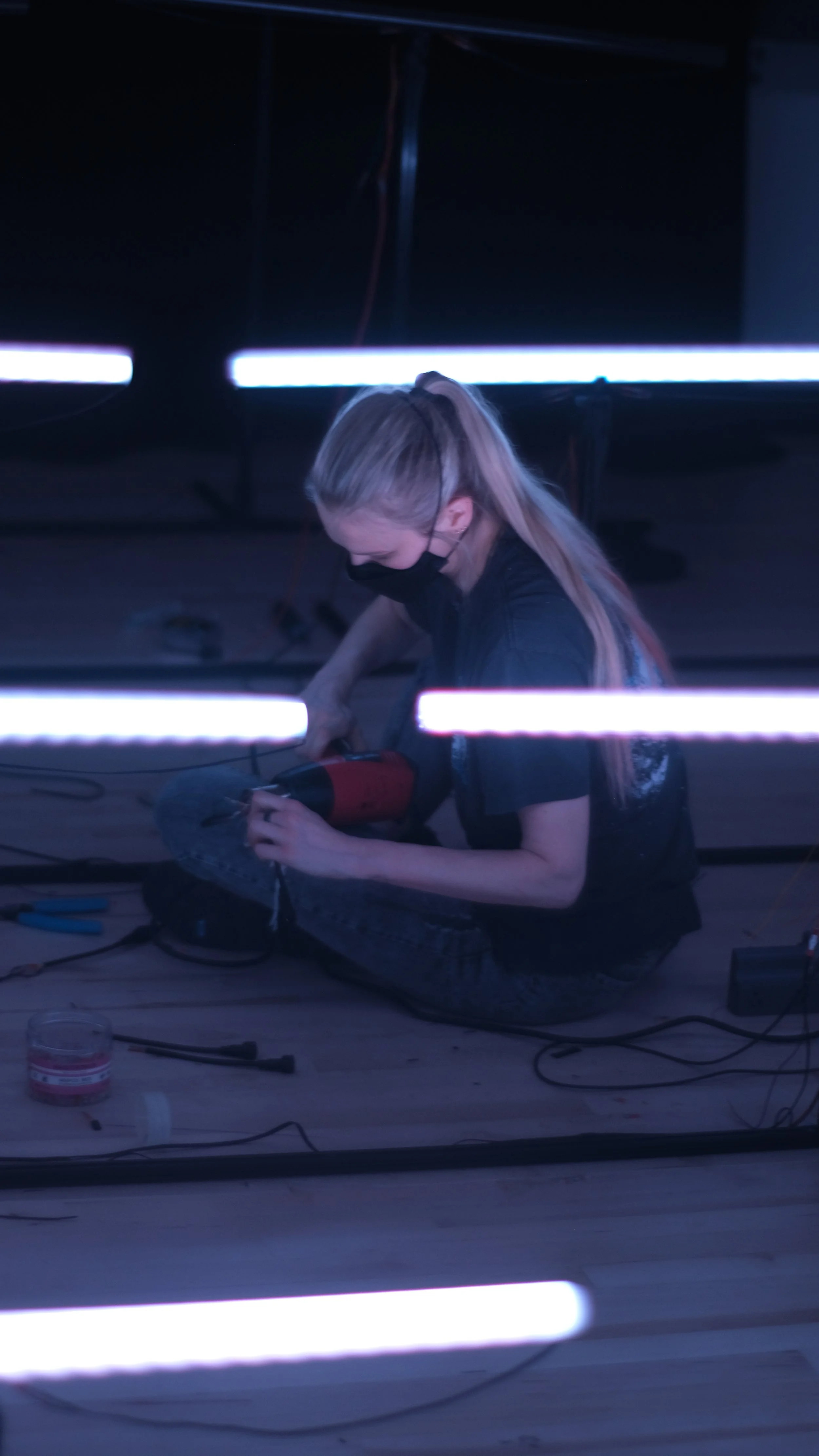 A large-scale installation and exploration of connection and emergent behavior through motion and communion with its viewers. The project was inspired by personal experimental music notation sketches, kinesthetics and body movement patterns, and the liminal spaces we traverse individually and collectively. It is a response to the rhythmic nature of human visual perception as its light sequences shift in response to environmental changes. The installation's elevation increases with each row as the light tubes cascade through the exhibition space.