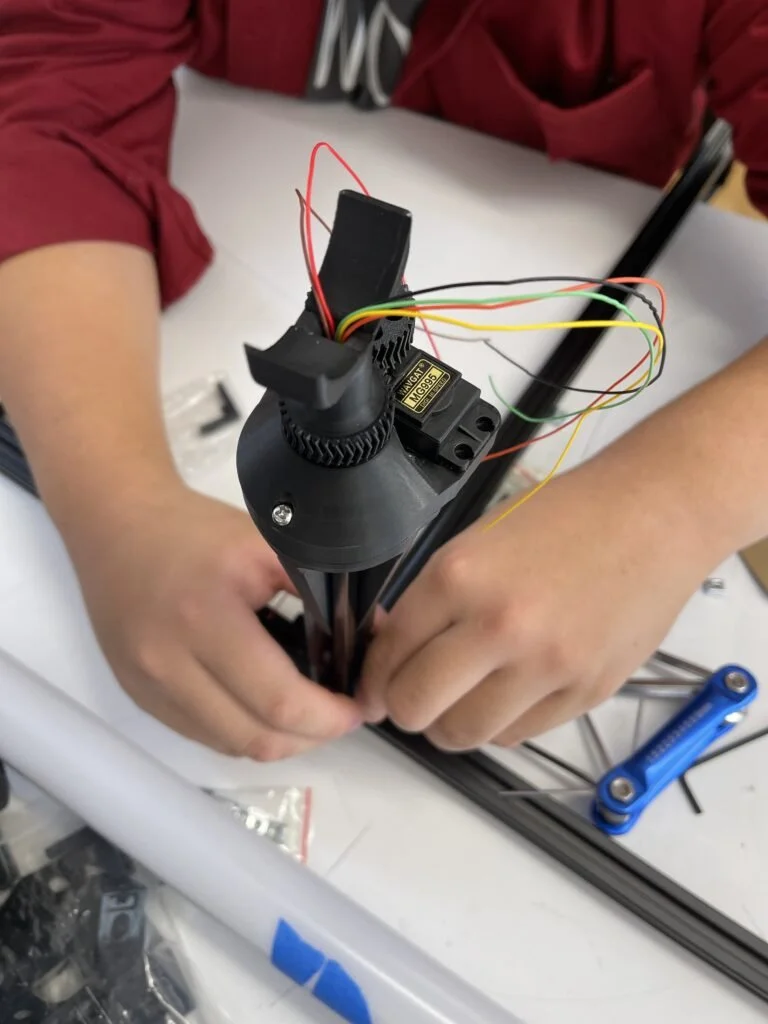 An upper part that houses the servo with gear, slip ring with wires, bearing, and the geared tube holder that’s holding the tube